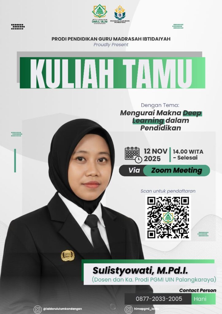 Program Studi Pendidikan Guru Madrasah Ibtidaiyah (PGMI) Institut Agama Islam Darul Ulum (IAIDU) Kandangan menyelenggarakan Kuliah Tamu dengan tema “Mengurai Makna Deep Learning dalam Pendidikan” pada Selasa, 12 November 2025. Kegiatan ini dilaksanakan secara daring melalui Zoom Meeting dan diikuti oleh mahasiswa serta dosen PGMI IAIDU Kandangan. Hadir sebagai narasumber, Sulistyowati, M.Pd.I, Ketua Program Studi […]